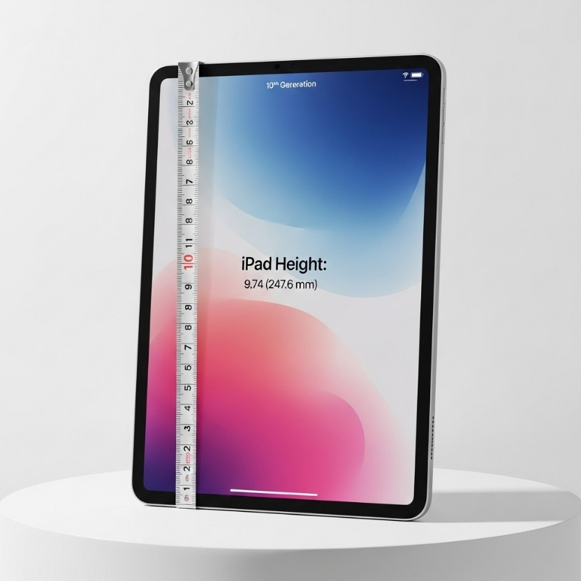 The iPad 10th generation height measures 9.79 inches precisely. Extremely close to 10 inches, nearly perfect reference. Apple’s tablets maintain consistent sizing across production batches.